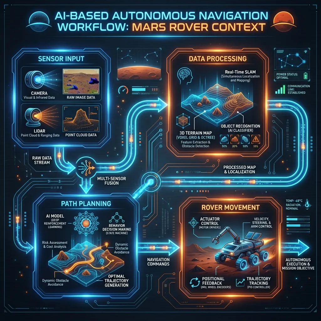 A NASA egy olyan egyedi rendszert fejlesztett, amelynek lelke egy fejlett AI modell. Ez a modell felel az "AutoNav" (autonóm navigáció) funkcióért. A folyamat a következőképpen zajlik: a rover megáll, a sztereó kameráival több képet készít a környezetéről, majd az AI ezekből egy 3D-s tereptérképet generál. Ezen a térképen azonosítja a veszélyes területeket (pl. túl meredek lejtő, éles szikla) és a biztonságos zónákat.